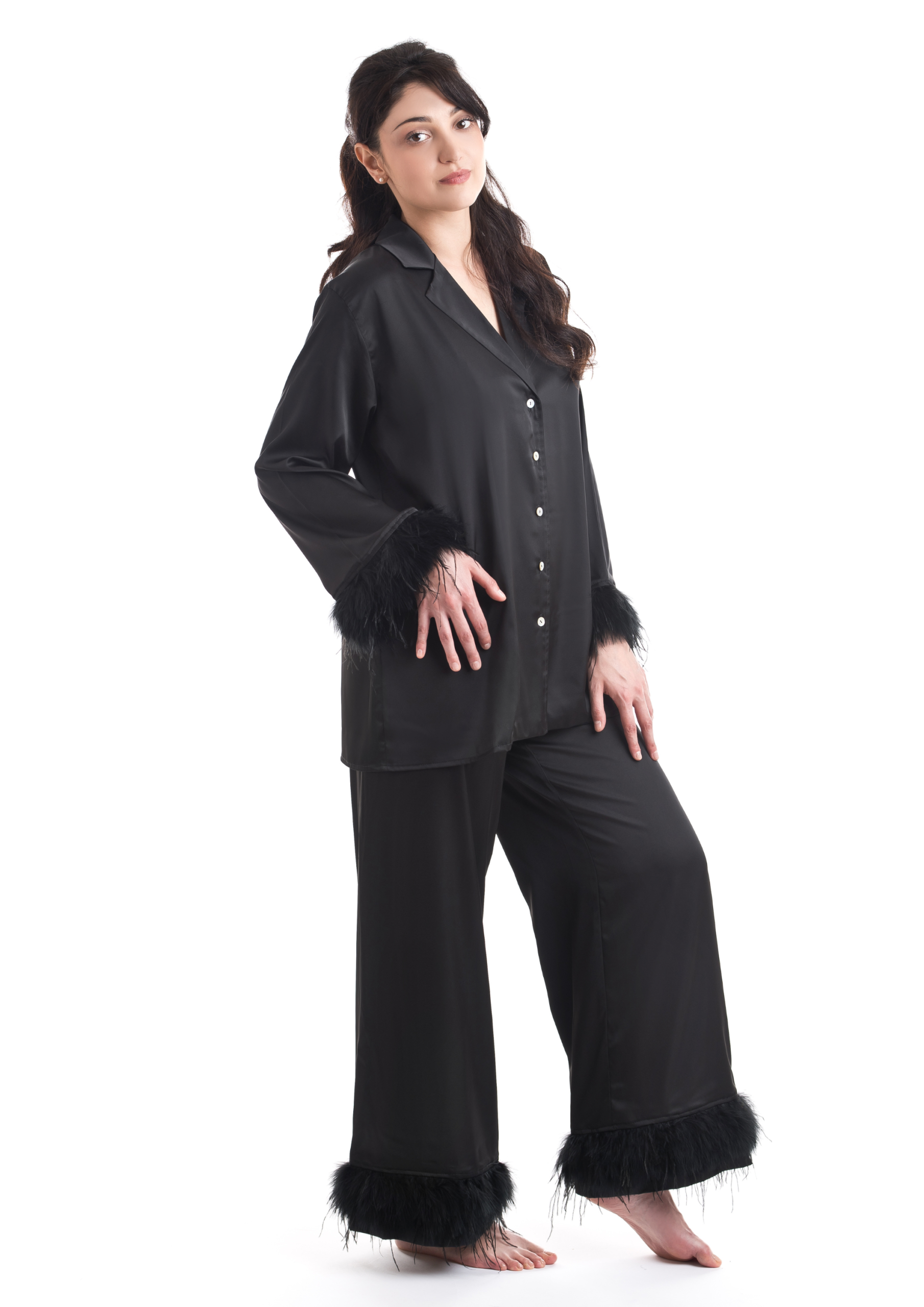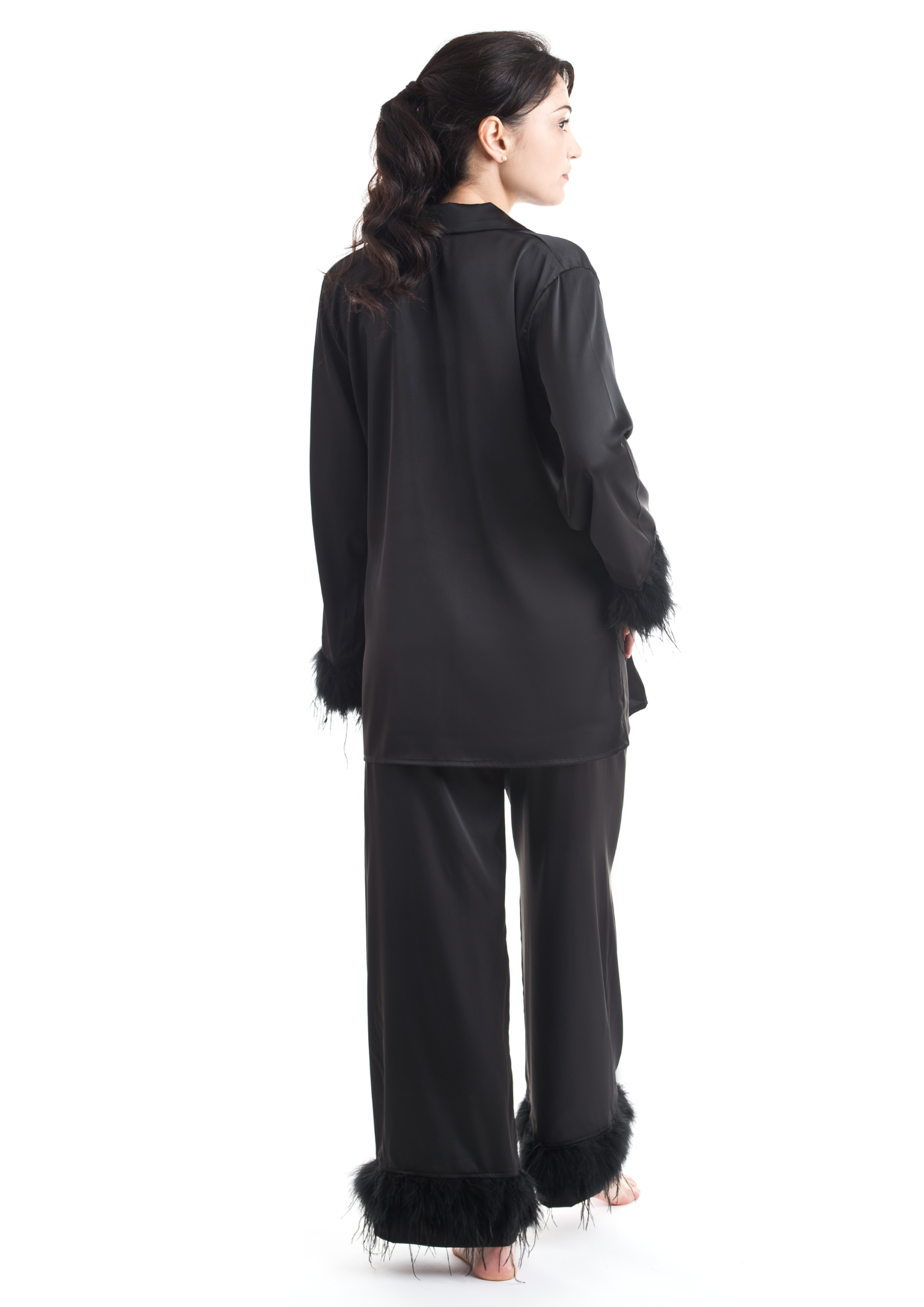 Satin pajama set with ostrich and marabou feathers, featuring wide-leg palazzo trousers with an elasticated waistband and a single inner-leg seam for enhanced comfort.
