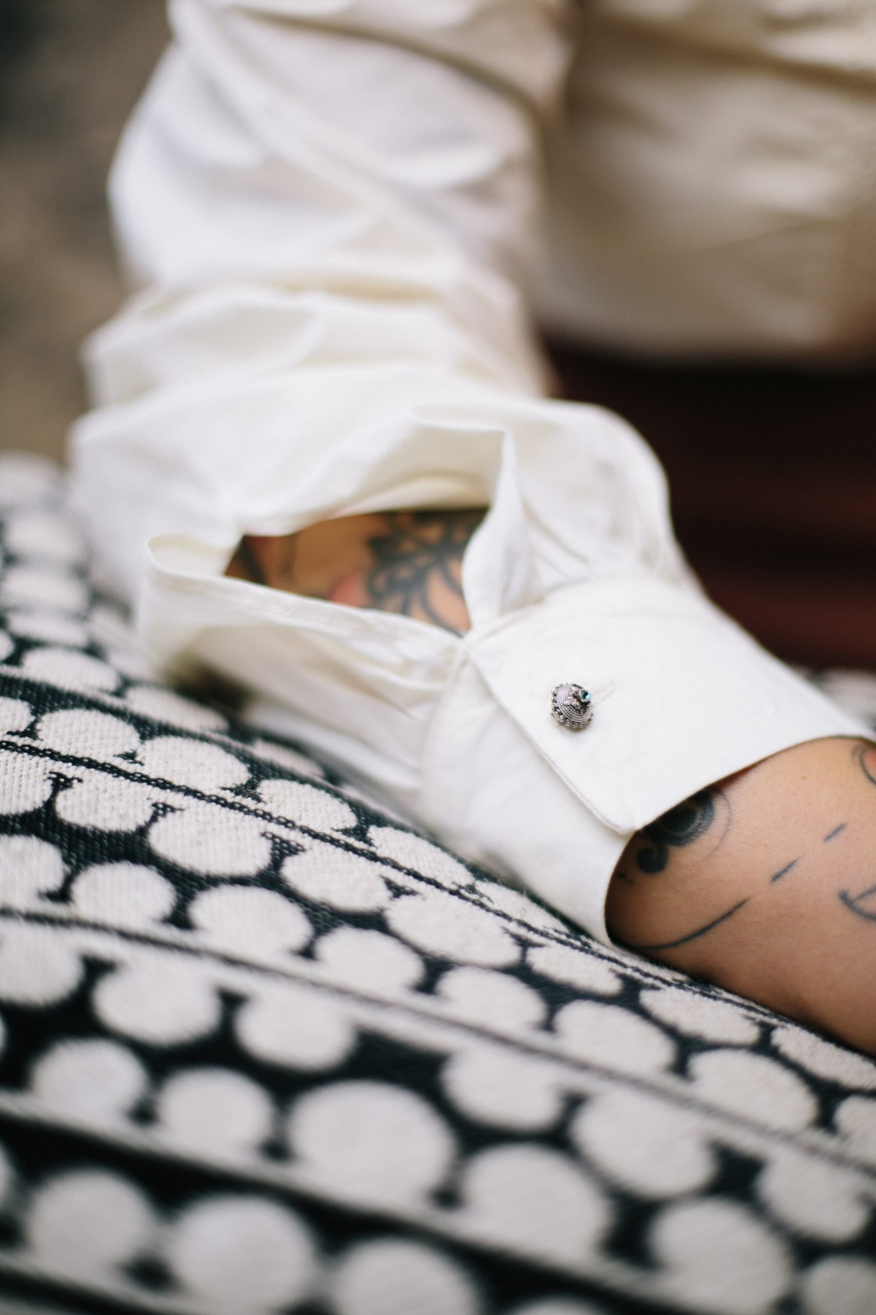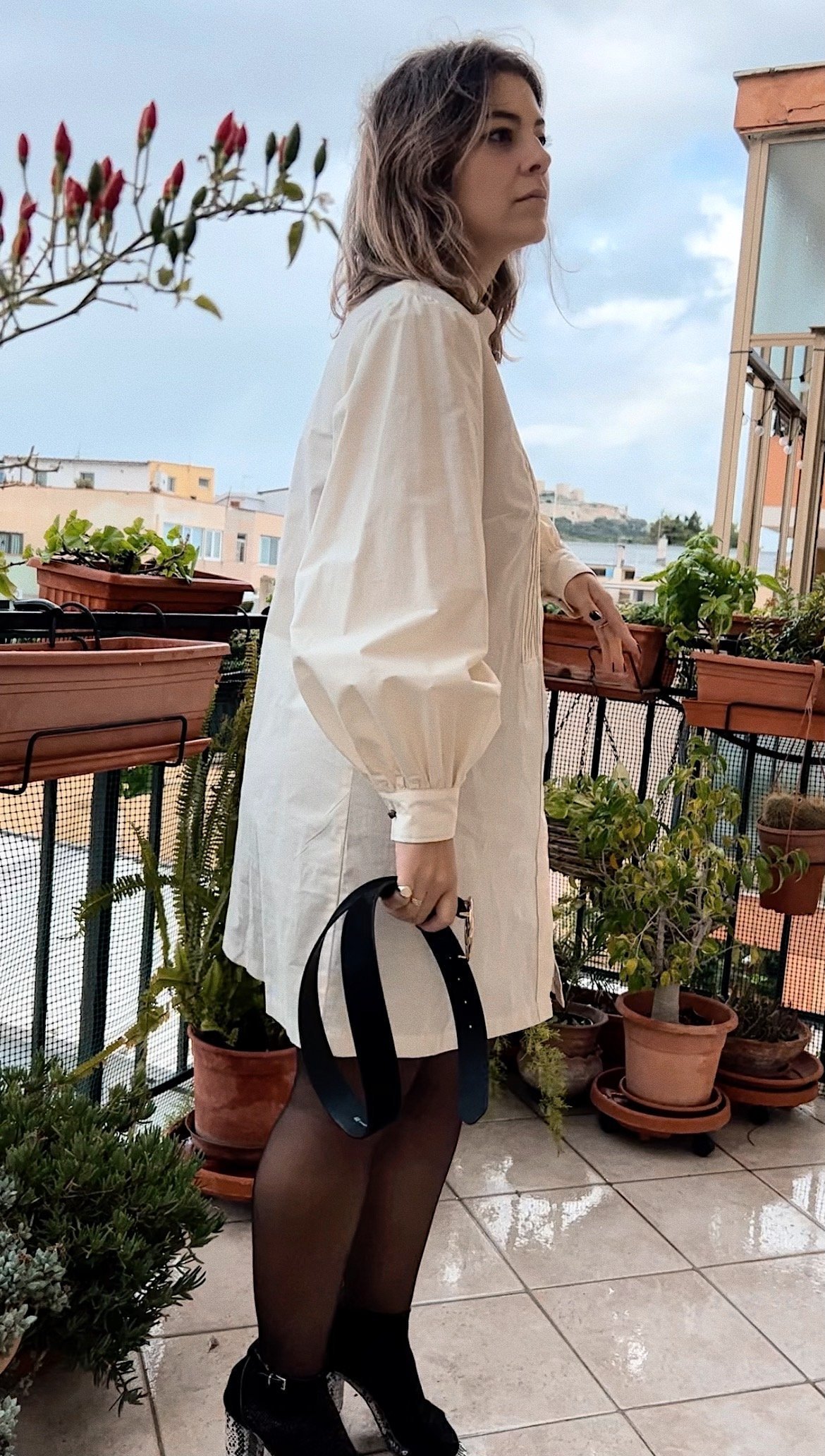 Isola è una camicia in Popeline di Cotone, color guscio d'uovo, con manica over e collo alla coreana, abbottonatura frontale nascosta con bottoncini in madre perla, impreziosita dalla pettorina a pieghe e bottoni in Argento e pietre di Glauco creazioni