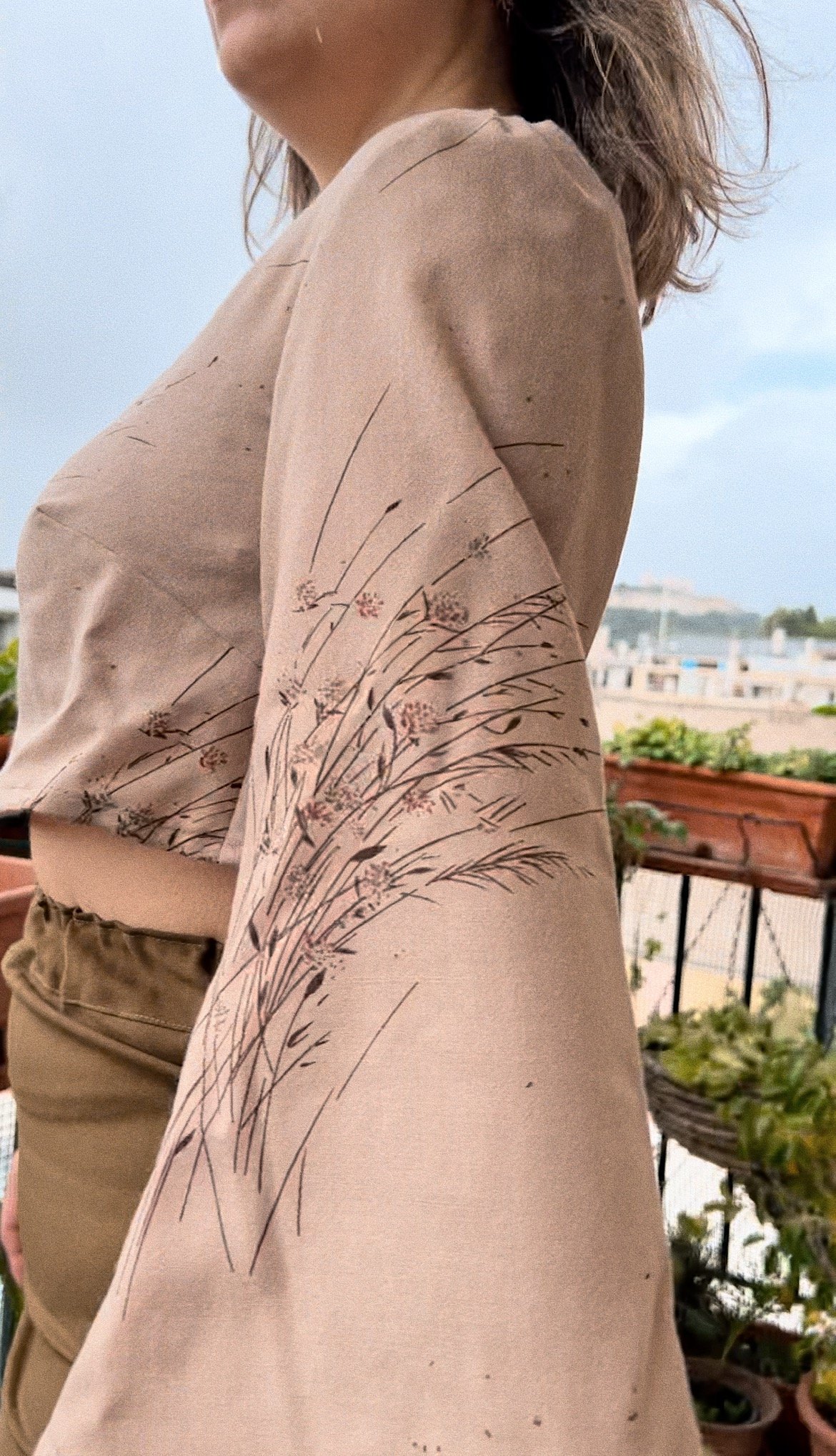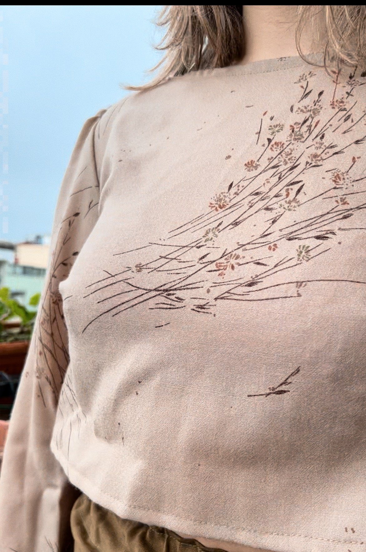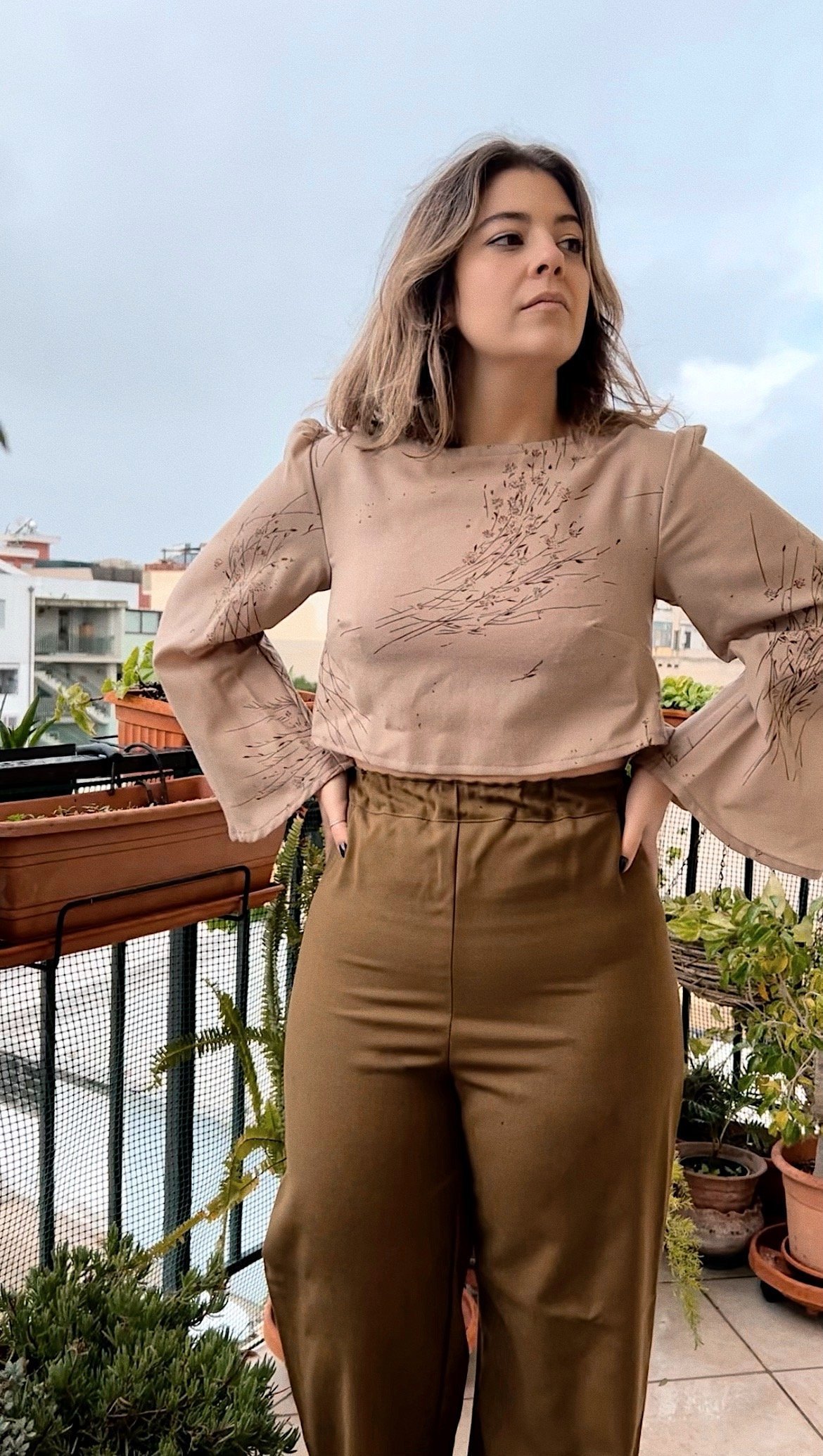 Il crop top ha la manica scampanata e leggermente arricciata sulla spalla.