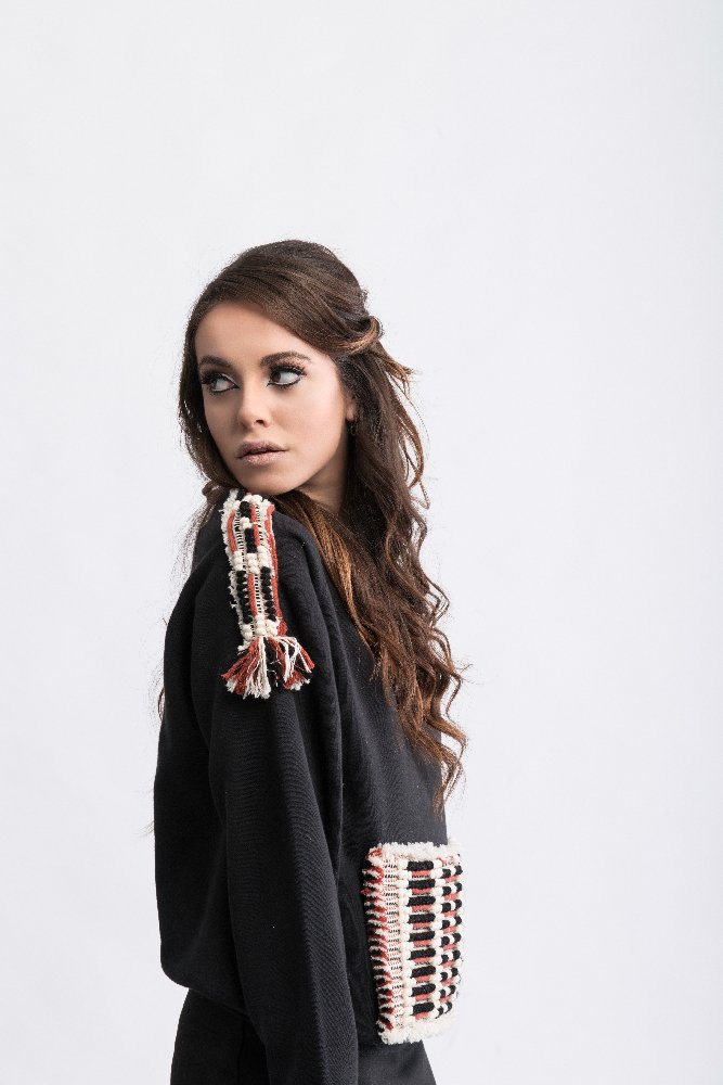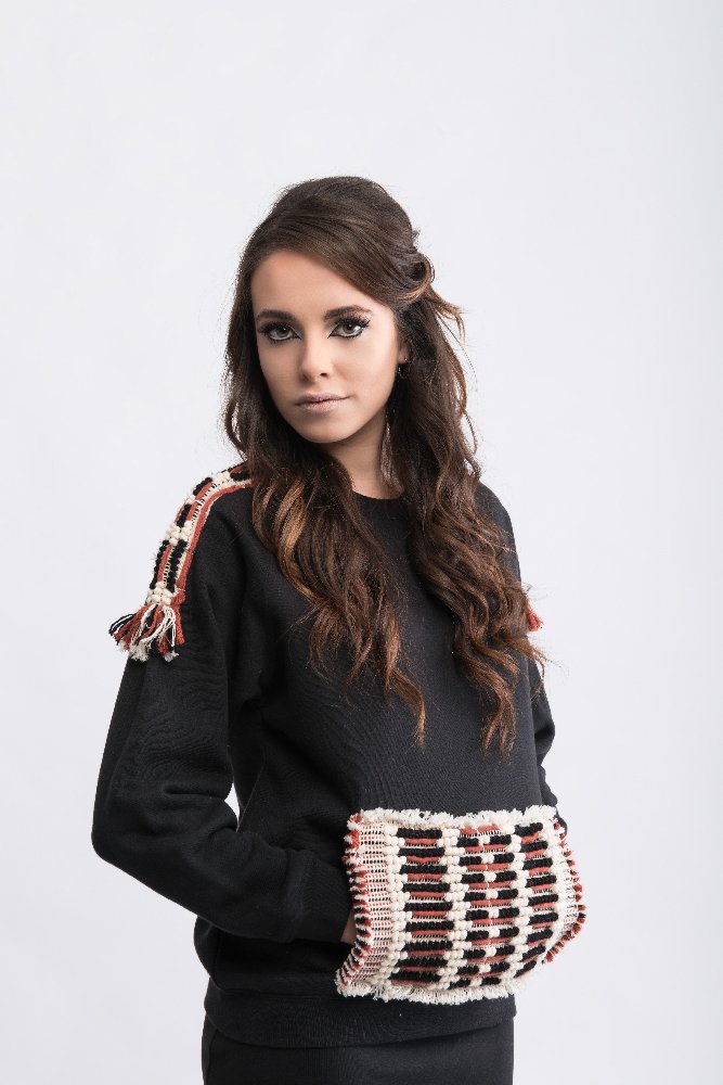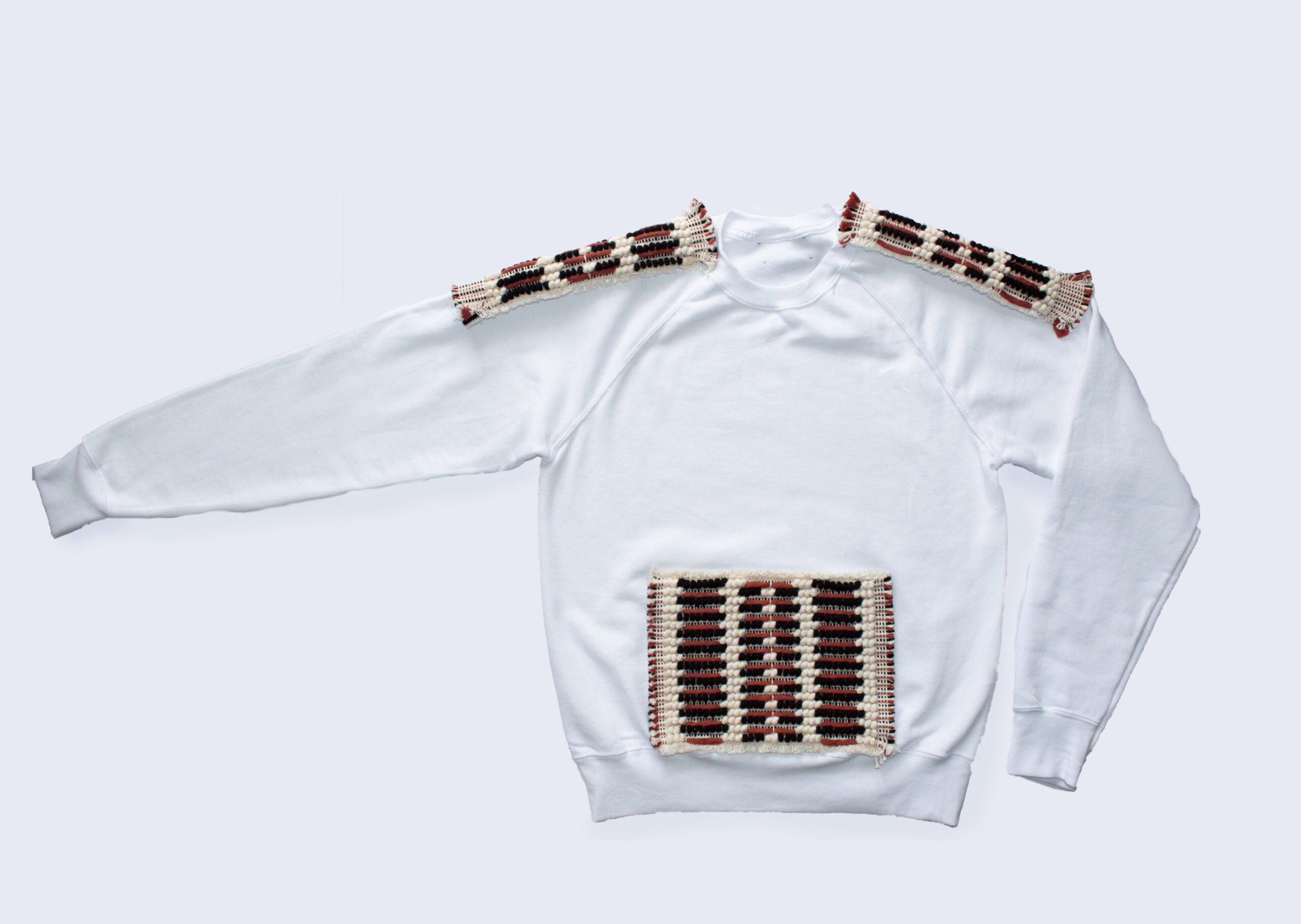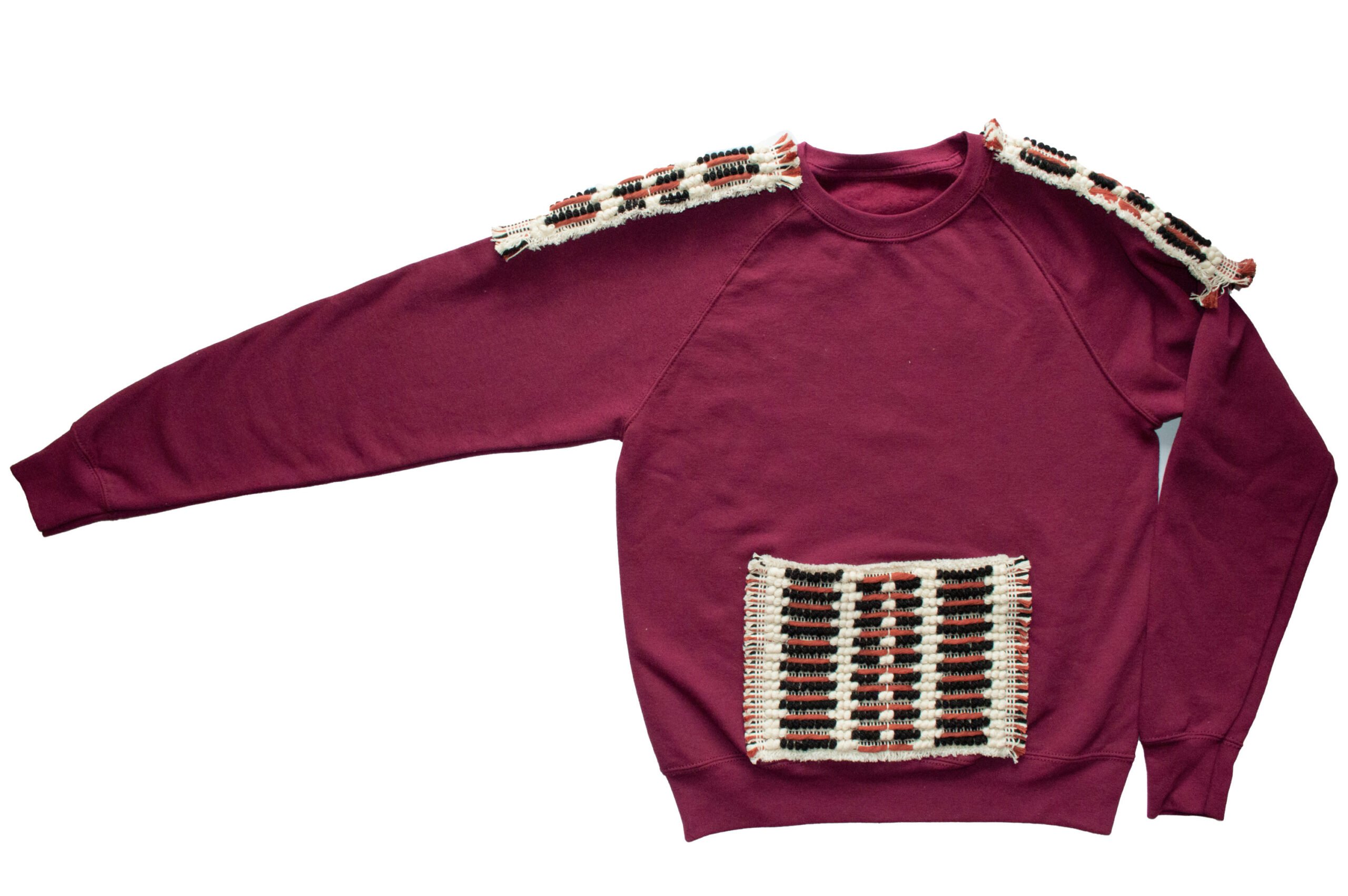 The sweatshirt is characterized by the unisex cut and the Raglan or American sleeves embellished by the details of the pocket and shoulders with the “dots and lines” loom fabric.